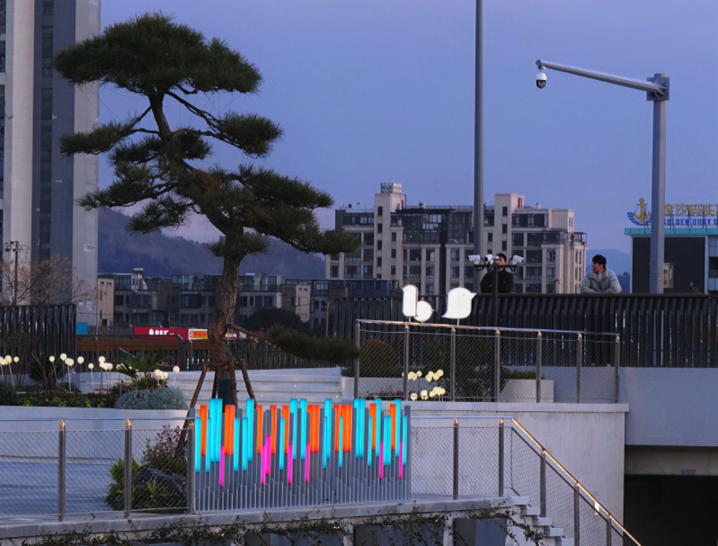 商业氛围整体设计暗藏巧思,四大主题分区各成风景:西广场香雪球铺就清雅阅读场景,渔人码头热带植物营造森系度假氛围,花间集市绣球花绽放浪漫艺术气息,东一街禅意绿植复刻古墟生活本真。商业外摆延续 “更浪更自由” 的理念,A/B 型布局搭配藤编、木调家具,甲板式社交空间与露营风休憩区,尽显松弛微醺的度假感。